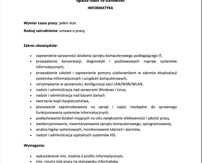 W dziale PRACA zamieszczono ogłoszenie o naborze na stanowisko informatyka.