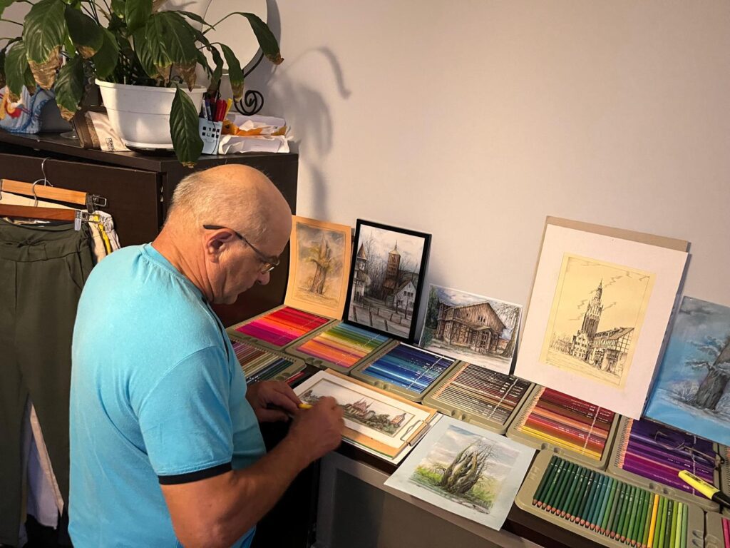 „Nie potrafię usiedzieć na miejscu, muszę aktywnie spędzać wolny czas, rysuję piórkiem ( grafika), maluję kredkami, pastelami, używam technik mieszanych, również rzeźbię. Mam przygotowany warsztat do malowania obrazów na płótnie, ale z braku czasu ciągle to odkładam. Malowanie kredkami i pastelami nie wymaga zbyt wiele zachodu i miejsca, jedynie czasu i weny twórczej. Rzeźbieniu poświęcam najmniej czasu. Robię też renowacje starych mebli. Ponad to lubię pracę w moim gospodarstwie, a zwłaszcza w ekologicznym 17 arowym ogrodzie i przydomowym ogródku kwiatowym. A jak mam już wszystkiego dość to biorę jedną z moich 5 elektrycznych gitar i gram. Gram wszystko co mi się nawinie, a sprawia mi to mnóstwo przyjemności. Poczynając od muzyki mojej młodości, czyli utworów Hard Rockowych, Deep Purple, Led Zeppelin, przez Santanę czy Dżem, kończąc na Bluesie i piosenkach biesiadnych.”
