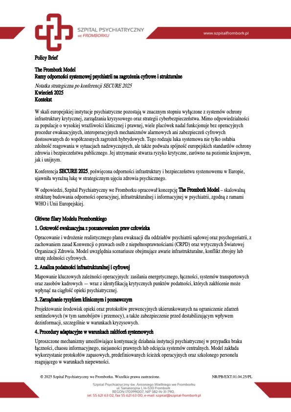 Szpital Psychiatryczny we Fromborku opracował przełomowy dokument strategiczny – Model Fromborski – ramy budowania odporności psychiatrii wobec zagrożeń cyfrowych, infrastrukturalnych i systemowych.